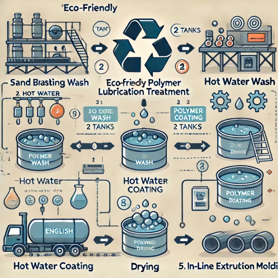 环保型高分子润滑处理推荐工艺流程:(4道、2槽;合计约2分钟) 1.喷砂 2.热水洗 3.高分子涂覆 4.烘干 5.In-Line 积压成型