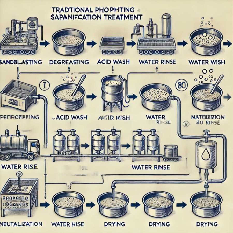 传统磷皂化处理工序:(10道、8槽工序、合计约40分钟) 1.喷砂 2.脱脂 3.水洗 4.酸洗 5.水洗 6.磷化 7.水洗 8.中和 9.皂化 10.烘干